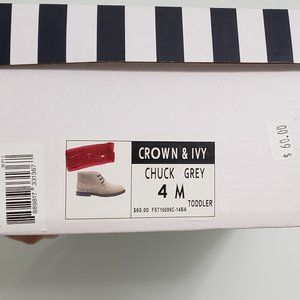 Brand New Crown & Ivy Kids Chuck Boots Size 4 in original box. Gender neutral shoe in awesome grey color that will go with anything. Bought for daughter but she jumped a whole size overnight.