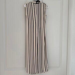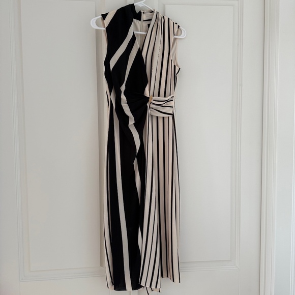 Beautiful woman's dress, never worn. Donna Karan brand, purchased from Macy's. Mid-calf length, cross-over v-neck front, zipper back. Gold metal trim at front waistline. Size 2.