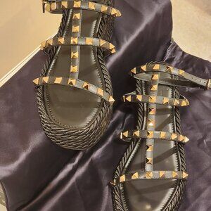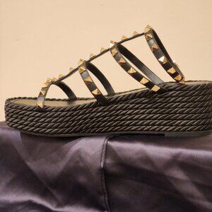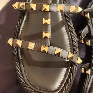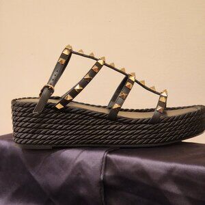 This beautiful, elegant, sexy platform sandals have never been worn & sitting in my closet. Excellent choice!! Product details: • Design: strappy platform sandal with silky cords wrapping a lofty wedge • Open toe • Slip on • gleaming signature rockstuds • adjustable ankle strap w/ buckle closure leather upper & lining/synthetic sole • Fit: Runs true to size. • Size: EU 39 (US 8 - I am Size 8 in Nike Sneakers and this fits me beautifully!!) • Color: Black leather/Gold rockstuds • Made in Italy. • CONDITION: New • SIGN OF WEAR: None • DIMENSIONS (approximate): 1.25” front height, 2.5" Heel height ________________________________________ About this item • Valentino Garavani's sandals are embellished with signature 'Rockstuds' tracing the cage straps. A riff on classic espadrilles, they're set on braided wedge soles and fasten at the ankle straps. • LEATHER: o Made with high quality leather that is beautifully designed, & durable. o Features high quality gold rockstud hardware. o Combination of black leather, gold studs & sleek braided espadrilles. o Imported • FASHIONABLE: With a simple design, this Valentino Garavani Sandal can be paired with a variety of outfits while maintaining its simply beautiful & minimalist look. Whether you need sandals for casual daily use or evening dinner events these sandals work for any occasion. This package includes: • Valentino Espadrille Platform Sandals (one pair) • Valentino dust cover not included ***Reasonable Offers Welcome!!***