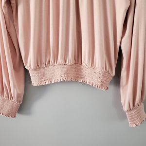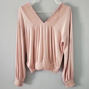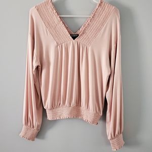 Brand new Express top with a thick cinched elastic detailed V cut front and back along with thick elastic cinching at waist and sleeve cuffs. Beautiful mauve color and nice light material.