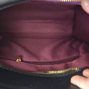 Beautiful texture and very well-made brown & black satchel bag. It comes with a long attachable strap, medium sized wallet, and a small card wallet. Burgandy fabric lined. Inside small pocket and outer zipper pocket.