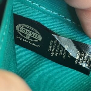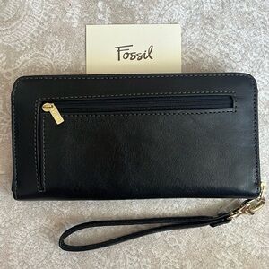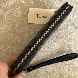 Brand New Fossil Genuine Leather Black Zip Around Wristlet Wallet w/ Gold Tone Metal & Teal Interior. Approximately 7.75” x 4” x 0.75”. Please note that the back zippered compartment has some residue from the magnetic security strip. The teal on the inside is so striking!