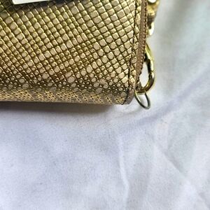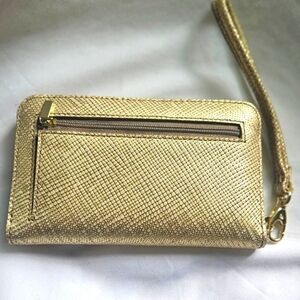 Stylish Fossil wristlet in metallic gold. Perfect for a night out. Compact and elegant design. Detachable strap.
