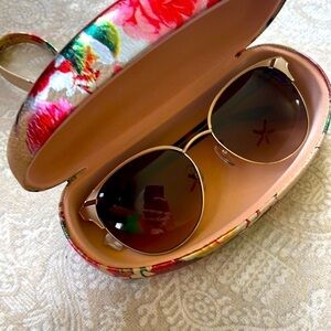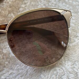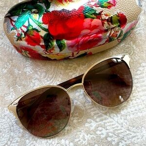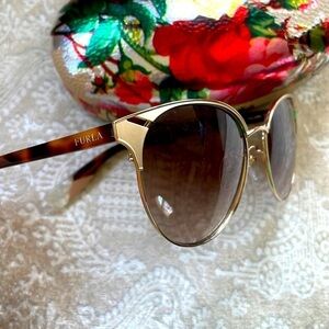 Brand New Furla Gold Tone Full Rim Round Cat Eye Sunglasses Tortoise Arms. Very minor scratch on left lens (see photos). Gorgeous floral case included. Size 56-17-140.