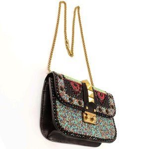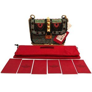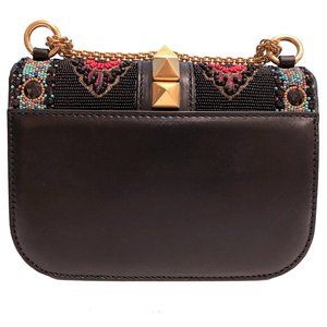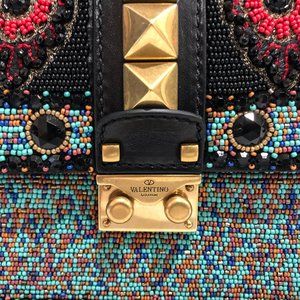 Brand New, authentic Valentino Garavani Rockstuds Lock Small Beaded African Eyes Crossbody Bag in Black leather. It comes with tags, dust bag, and care documentation.