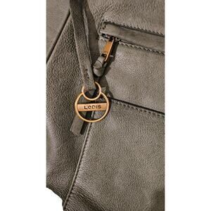 Beautifully crafted, this Tote by Lodis is 14x13x4 approximately. It has outside pockets and plenty of room inside.Never used, this Tote is made of luxurious green leather. Great for vacations or shopping, heads will turn when you wear this gorgeous bag.