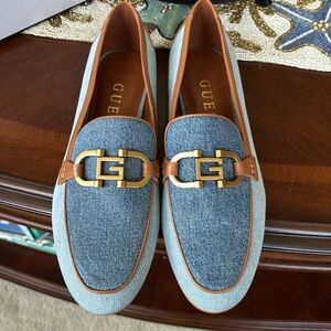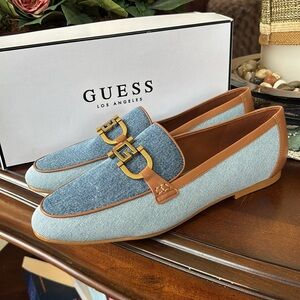 Brand New Guess Isaac Loafer Light Blue Denim Flats Neutral Tan Leather Trim