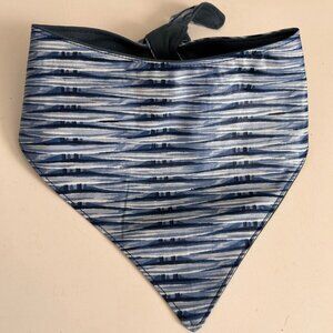 The dog scarf is reversible with a blue/grey on one side and multicolor blue on the other.