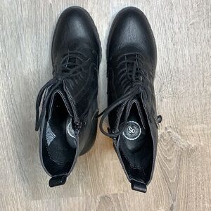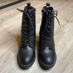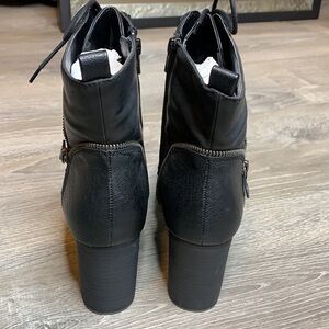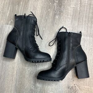 High heel lace up boots with cool zipper decor. Brand new in box. Please see images for color and measurements.