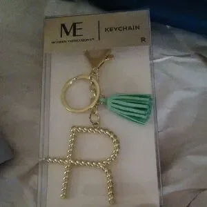 This is a goldtone letter "R" keychain with an adorable mint green tassel. Could also be used as a bag charm.