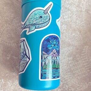 Turquoise w/ unicorn dolphin, airplane, mountain range, butterfly, stained glass. Adventure awaits!