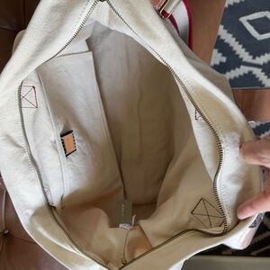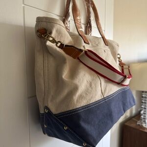 Brand new J.Crew Montauk Weekender large travel tote bag in cream with blue and red accents. It’s the perfect size for a weekend getaway or to tote your laptop and other large items. Made with a soft washed canvas and leather handles plus an adjustable, removable crossbody strap. No longer available at J.Crew so get it while you can!