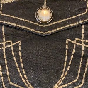 BRAND NEW AND NEVER WORN WITH TAGS INTACT! Size 5, Dark Denim with jeweled pockets and button. Originally purchased from Macy’s.