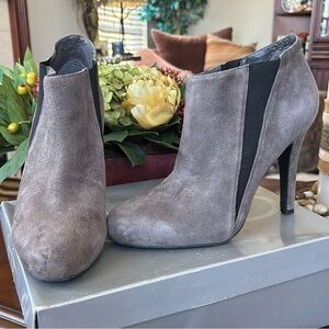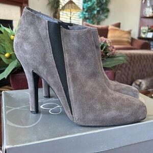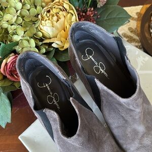 Brand New Jessica Simpson Genuine Suede Gray & Black Slip On Heeled Booties Boot.