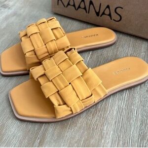 Brand new in box, Kaanas Belinha Marigold basketweave Size 7 walking sandal with genuine leather upper and flat rubber coated leather sole. Hand made by local artisans in Brazil.