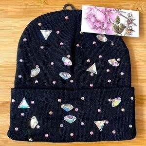 Brand New Kensie Black Knit Stretch Beanie Hat w/ Iridescent Jewel Beads & Studs. Super pretty!