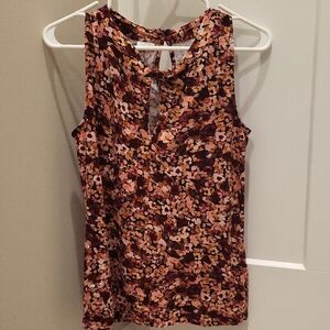This sleeveless blouse features a delicate floral pattern in pink and orange hues, perfect for adding a touch of elegance to your outfit. The lightweight fabric and keyhole neckline make it ideal for warm weather or layering. Its casual yet sophisticated style is suitable for both everyday wear and special occasions.