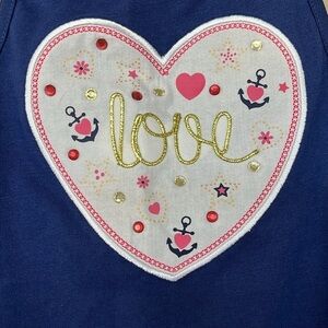 Brand New Little Lass 2-Piece Set Nautical Navy Blue Tank Top & Striped Shorts. Bejeweled heart with metallic embroidered “Love.” Girls size 6. Very cute & stylish!