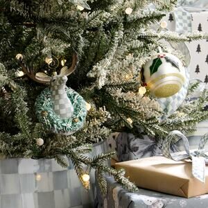 Brand New Mackenzie-Childs Holly Leaf Glass Ball Ornaments, Set of 6