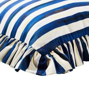 Add a touch of elegance to your home with this brand new Mackenzie-Childs Royal Stripe Ruffle Throw Pillow. Featuring a stunning blue and white royal stripe design with a charming ruffle trim, this 20” x 20” decorative pillow brings classic style and comfort to any space. Perfect for sofas, beds, or accent chairs, it’s both stylish and practical—machine washable and imported for premium quality. Elevate your home décor with this GORGEOUS and timeless piece