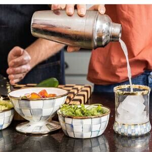 Two scoops or three? As if we didn't love ice cream enough, now it can be served up in Mackenzie-Childs' dapper design! Each pedestal bowl is rimmed in bronze stainless steel to provide a polished look against the playful checked background. What a treat! From MacKenzie-Childs.