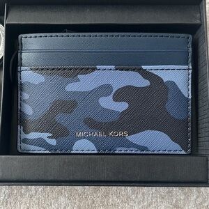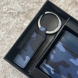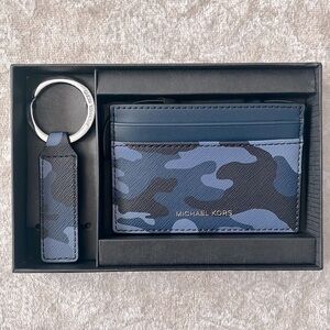 Brand New Michael Kors Admiral Blue Camo Card Holder Case & Key Fob Ring Box Set. Makes a great gift for him!