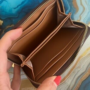 Brand New Michael Kors Brown Acorn Small Zip Around Card Case Holder Compact. Approximately 5” x 3.25” x 0.75”.