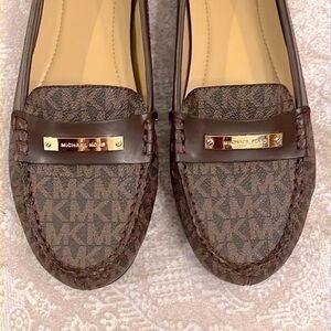 Brand New Michael Kors Brown Loafers Slip On Flats w/ Gold Tone Metal Logo Bar. I have just two pairs of these available -- sizes 8 and 8.5 -- act fast! No box. These are great for the office!