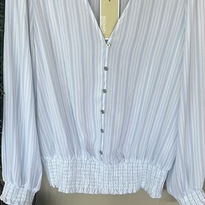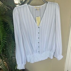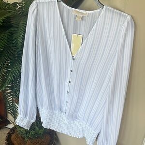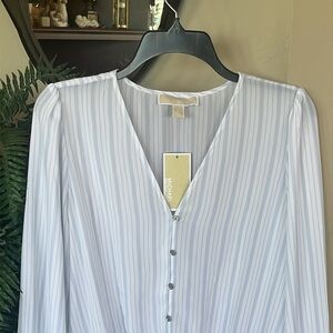 Brand New Michael Kors Striped Blouse Stretch Hem Cuffs White & Blue w/ Buttons. Women’s size Medium. Absolutely stunning! Classic and stylish v-neck!