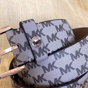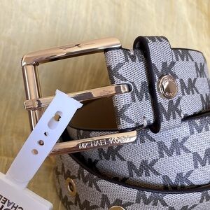 Brand New Michael Kors Tan & Brown Logo Belt w/ Gold Tone Buckle, Accent & Holes. At this time, I have just one size Small, two size Mediums and one size Large available. Size Medium is pictured in photos. Such a gorgeous, versatile belt!
