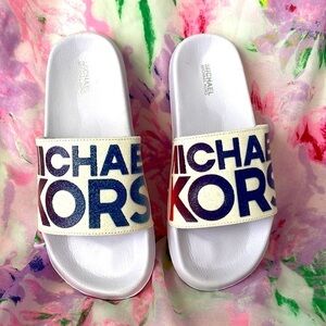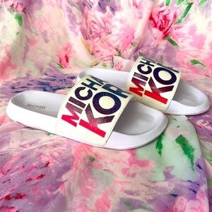 Brand New Michael Kors White Shimmer Multicolor Logo Slides Sandals. Women’s size 5. No box. Gorgeous for summer!