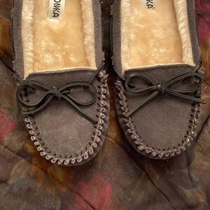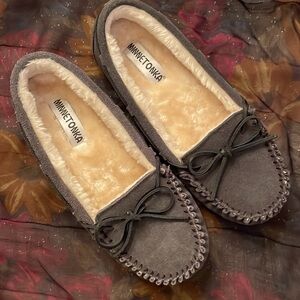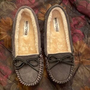 Brand New Minnetonka Genuine Leather Slip On Faux Fur Moccasins Gray. Women's size 10. No box.