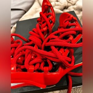 This rope lace up gladiator is carefully crafted with buttery, soft, red, leather. The tonal red rope wraps and ties effortlessly up the leg. The metal silver end pieces give this style that High luxury finish. It has a silver zipper up along the back of the shoe which makes for easy fastening and removing. The shoe’s material is a red calf leather with red rope and silver zipper end pieces. The height is 115 mm/4.5 inches. These shoes were made in Italy.