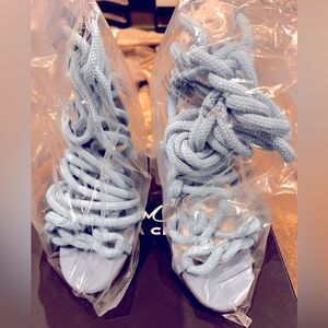 Brand New Monika Chiang Signature Rope Lace-Up Gladiator Sandal in the most beautiful soft sky blue suede color! These wrap up the leg sandals are stunning! They provide easy fastening and removal from the silver zipper on the back of the shoe. Hurry to purchase these as they won’t disappoint!