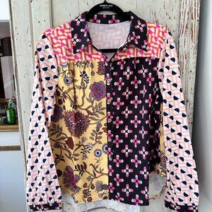 Stunning women's button down shirt featuring a vibrant multicolor design of flowers and shapes.