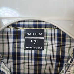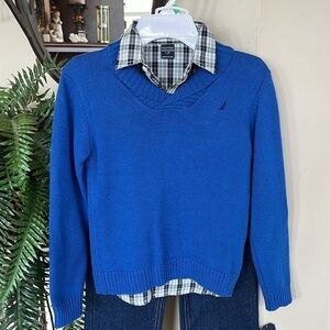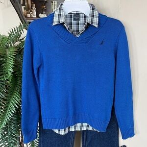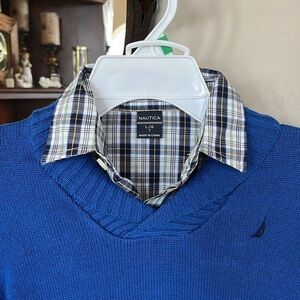 Brand New Nautica 3-Piece Set Blue Sweater Button Up Plaid Shirt Dark Wash Jeans. Boys size Large (7).