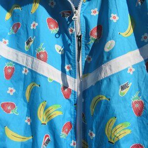 I am selling a Brand New Nike Banana Strawberry Epic Training Jacket Women's Size Small CJ3719. It is brand new with tags. The jacket is a women's size Small. It is blue with bananas, strawberries, and flowers all over it. It has white trim and a drawstring around the waist. There is a zipper down the front of the jacket.