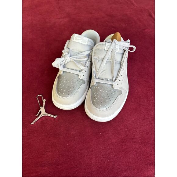 The perfect combination of style and comfort. These sneakers feature a classic white and silver colorway, designed to elevate your streetwear look. The Air Jordan 1 Low silhouette offers a sleek and timeless design, while the lace-up closure ensures a secure fit. Whether you're hitting the gym or running errands, these shoes will keep you looking stylish and feeling supported all day long.