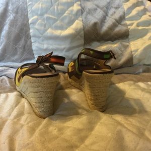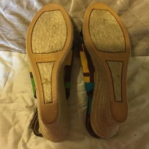 Beautiful multi-colored sandals never worn. Predominate colors brown and yellow. 3 inch wedged espadrilles. Made by Nine West.