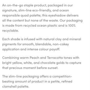 An on-the-go staple product, packaged in our signature, slim-line eco-friendly, and ocean responsible quad palette; this eyeshadow delivers all the content but none of the waste. Our packaging is made from recycled ocean plastic and is 100% recyclable.