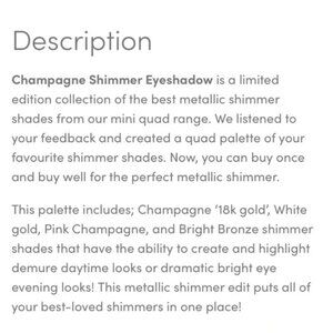Champagne Shimmer Eyeshadow is a limited edition collection of the best metallic shimmer shades from our mini quad range. We listened to your feedback and created a quad palette of your favourite shimmer shades. Now, you can buy once and buy well for the perfect metallic shimmer.