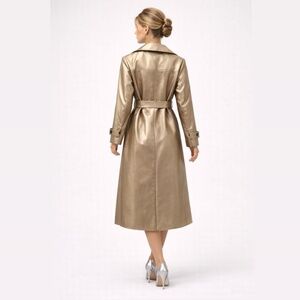 The coat features classic trench details like a double-breasted button closure, a matching self-tie belt, epaulette shoulders, and sleeve straps with buckles at the cuffs. It is a midi-length coat, often crafted with a high-shine metallic finish.
