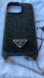 Brand new Black Crystal Prada Phone Case for IPhone 15 Plus. Comes with a sleek removable silver chain and signature triangle logo which you press and moves up and down to wear crossbody or shoulder style. Includes tag, box, authenticity cards, and dust bag.