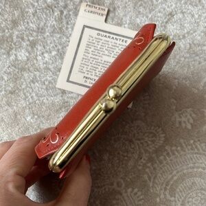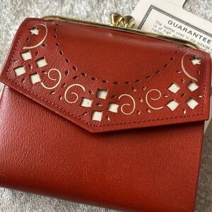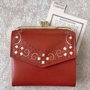 Brand New Princess Gardner VINTAGE Top Grain Cowhide Snap Close Burnt Red Cutout. Approximately 4” x 4”. Original paperwork!