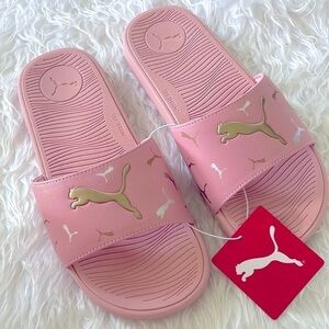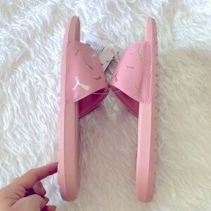 Brand New Puma Cool Cat 2.0 Toss Large Strap Slides Sandals Bridal Rose Pink w/ Gold Silver Metallic. Women’s size 9. Sporty & stylish!