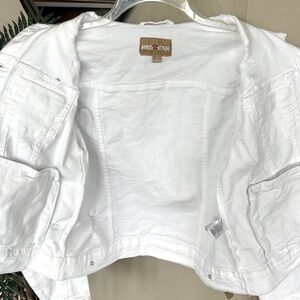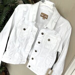 Brand New Red Star White Denim Button Up Collar Jean Jacket Distressed Cotton. Women’s size Small. Great to throw over a sundress for date night!