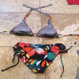 Super fun, reversible, flower tie print medium bottoms. Reversible black and white stripe and colorful strip top. Different and fun!