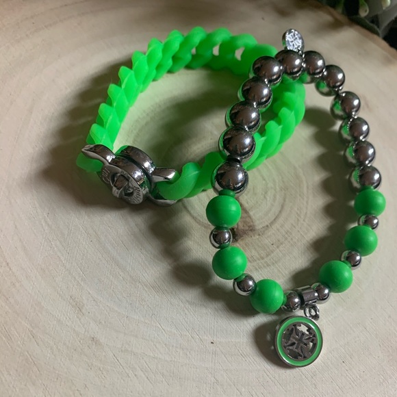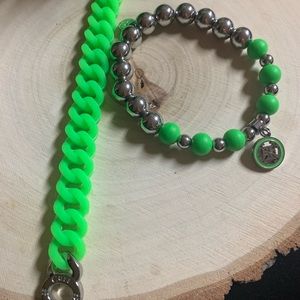 This RC set has never been worn. Excellent condition. Comes with the Allison bracelet with neon green beads separated with stainless steel spacer beads. The Allison retails for $42. The other bracelet is a rubber like material that has a metal clasp that retails for $22. Also Comes with a RC velvet bag. Would make a great Christmas gift