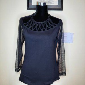 M035. Long sleeve boutique top has lace sleeves with elastic wrists, criss-cross bands on bodice, cold shoulder drop sleeve styling & fully adjustable bra style straps. Super easy to wear & care for! Brand new with tags.