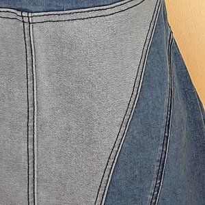 M084. Heavy stretch 2 tone denim sundress from Forever 21 has a completely full zipper front with figure flattering seaming detail. Straps are not adjustable. Lots of stretch...easily 2" to measurements below. A tank or lacey blouse could be worn underneath with a lowered zipper for versatility!